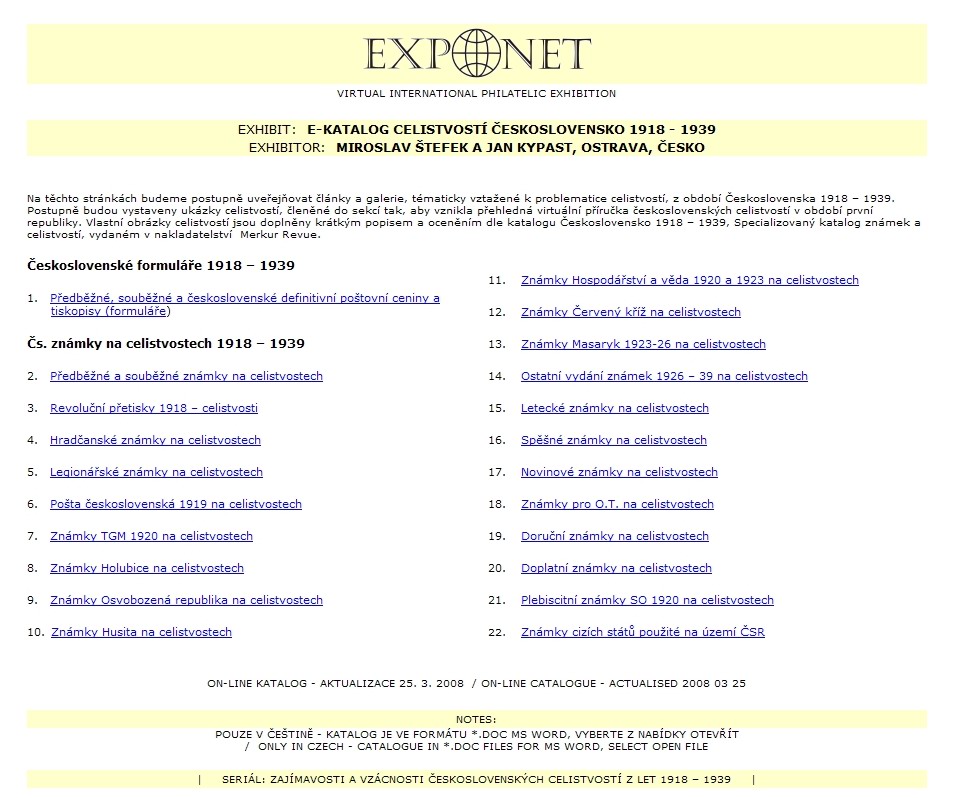 Na Exponetu jsem vystavil sestavu deskových čísel výplatních známek s portrétem presidenta TGM z let 1923-1925. Tato sestava je téměř kompletní a smyslem jejího zveřejnění bylo podat téměř ucelenou a troufám si říci i ojedinělou sbírku DČ tohoto období. Ihned po umístění exponátu na Exponetu jsem ale byl napaden, že exponát obsahuje tzv. "virtuální padělky" a vlastně nepřímo i ze zhotovení těchto padělků. Mrzí mě, že jsem v prvé řadě nebyl osloven já a požádán o vysvětlení, ale že byly rozesílány maily na všechny strany. Zásadně toto nařčení odmítám, naopak chci upozornit, že řada kusů měla původ ze sbírek Zd. Kvasničky a J. Nekvasila, kteří mě ochotně pomáhali ve snaze zkompletovat tato DČ. Jsem si vědom, že osočování a pomluvy se velice těžko vyvracejí a proto, abych tomuto zabránil hned zpočátku, rozhodl jsem se exponát z Exponetu stáhnout. Polemiky obdobného druhu a vzájemné osočování nijak filatelii neprospívají, jak jsme byli svědky již dříve a řada filatelistů je již tímto znechucena. Smyslem stažení exponátu je proto zamezit těmto výpadům a zbytečné polemice zabránit. Věřím, že většina filatelistů můj postup pochopí.