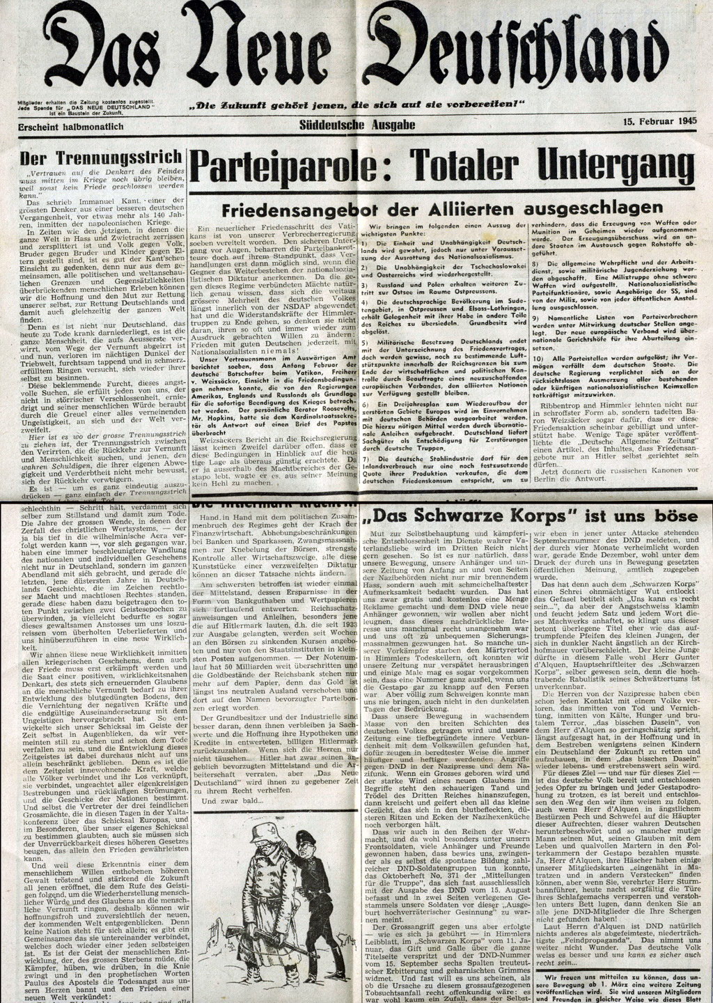 Největší překvapení ale skrýval obsah. V obou obálkách byl list novin "DAS NEUE DEUTSCHLAND" z dílny amerických tiskařů, obsahující řadu článků podrývajících Hittlerův režim, datované 15.2.1945. A hlavně - oba dopisy obsahovaly 5-pásku válečného falza č. 17 Hitler jako smrtka!
