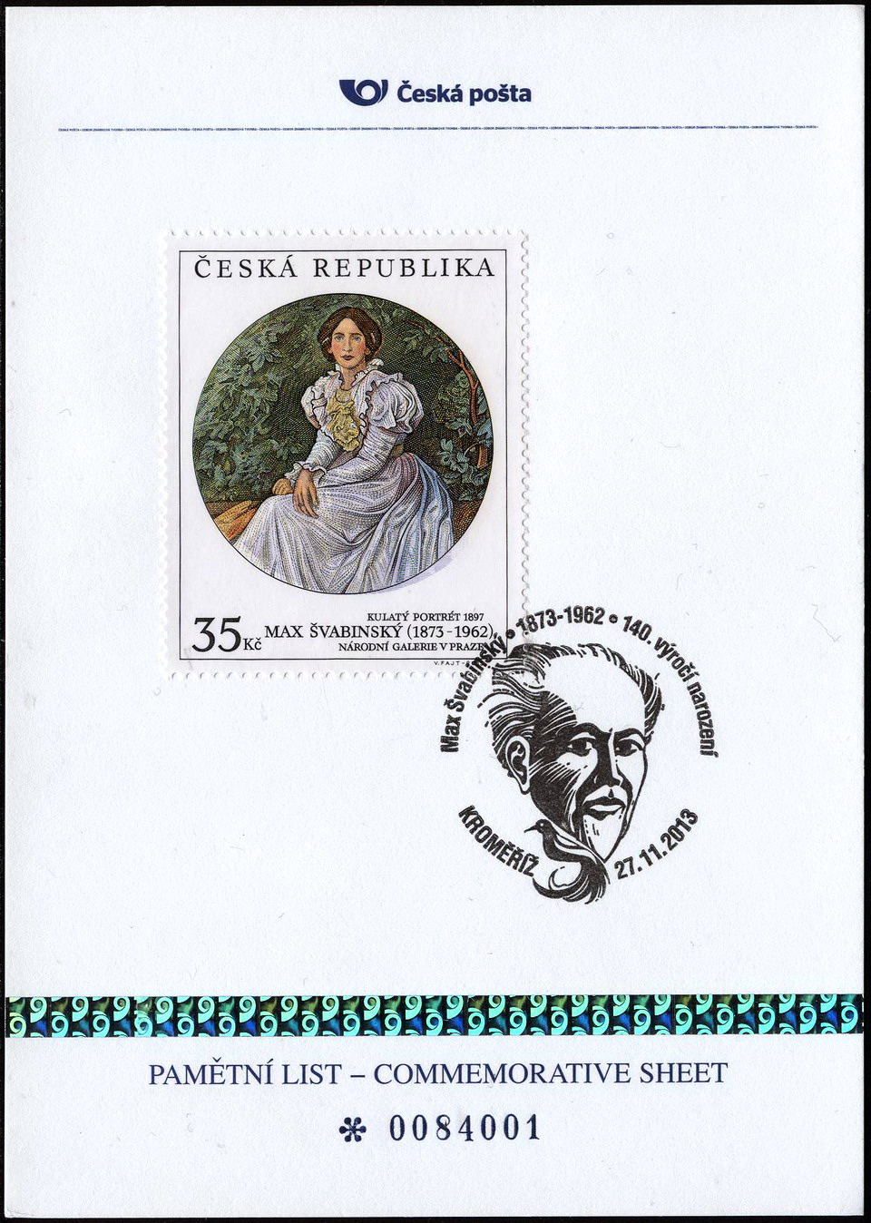 27. 11. 2013 (středa) – PLZ č. 38: „Max Švabinský – 140. výročí narození (17. 10. 1873, Kroměříž)“, poř. č. 84001 – 85900, s nalepenou příležitostnou známkou (k. č. 794, nominál 35,- Kč) „Umělecká díla na známkách – Max Švabinský (1873 – 1962)“ a otiskem pamětního razítka.