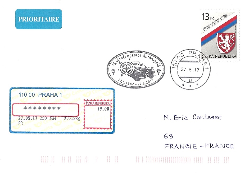75th anniversary of Operation Anthropoid - special Czech slogan cancellation / 75ème anniversaire de l'Opération Anthropoid - flamme spéciale tchèque