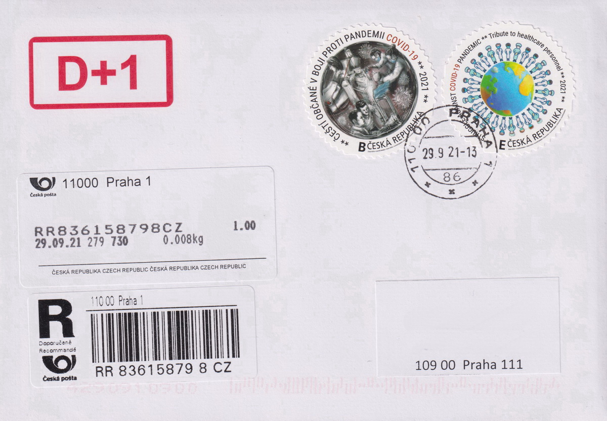 Kruhové známky "Čeští vedci v boji proti pademii Covid-19" na mnoho způsobů. Ani zde nejde o vyčerpávající počet, ale o ukázku většiny možností. Tradičně upozorňujeme na vzorné orazítkování a vypravení zásilek na poštovním úřadě Praha 1.